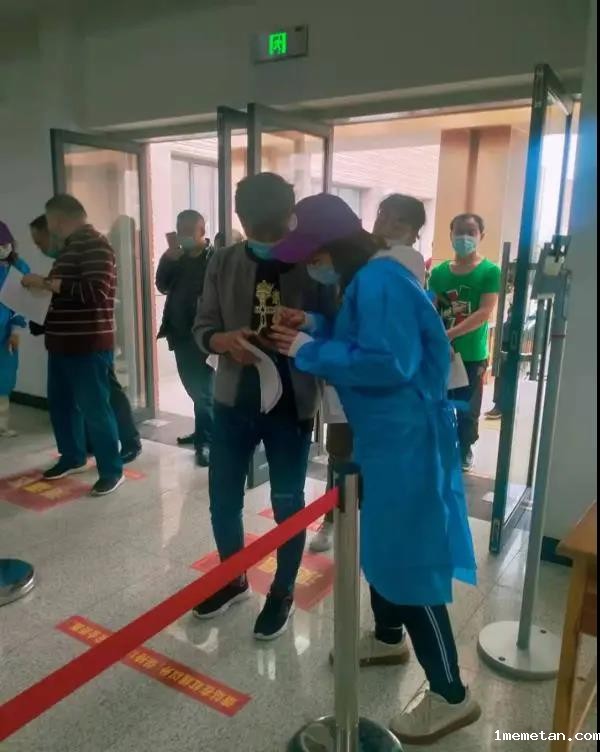 (志愿者协助医护工作者对疫苗留观时间核对)