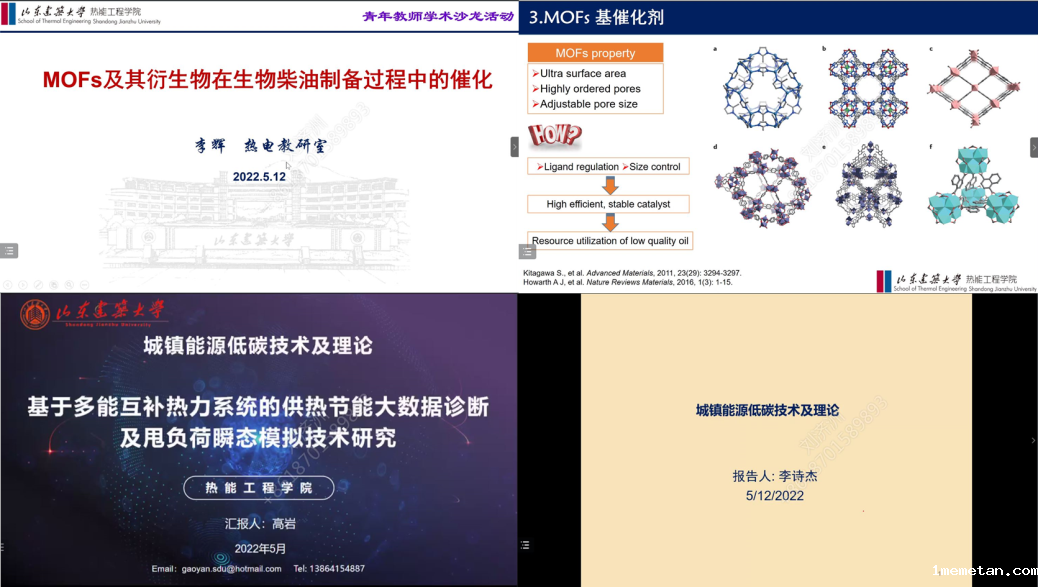 专家报告后,热能工程学院青年教师代表李辉副教授、高岩副教授和李诗杰博士分别就个人的研究方向和成果进行了汇报。针对生物柴油的制备,李辉副教授分享了MOFs材料及其衍生物在生物柴油制备的过程和方法;基于大数据分析,高岩副教授介绍了其近年来研究的多能互补和甩负荷模拟研究;李诗杰博士对碳基能源材料及储能和生物质热化学转化两个研究方向进行了介绍。